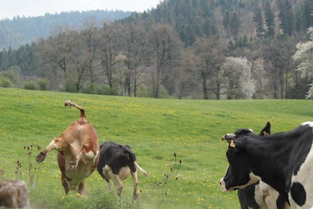 Unsere Milchkühe und ihre Kälber können von März bis November auf die Weide und frische Kräuter und Gräser genießen.